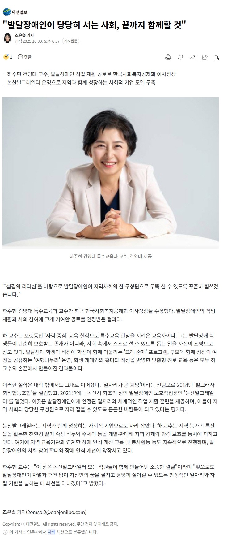 | 제목 | 하주현 건양대 교수, 발달장애인 직업 재활 공로로 한국사회복지공제회 이사장상 | ||||