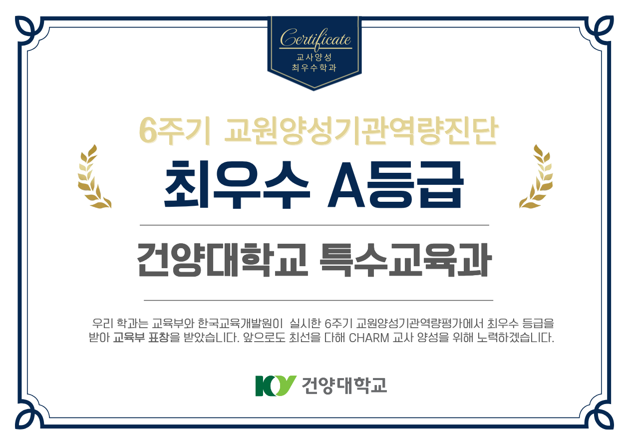 우리 건양대학교 특수교육과가 2025년 6주기 교원양성기관 역량진단 최종 결과에서 "A등급"을 받고 교육부장관 표창을 수상하게 되었다.