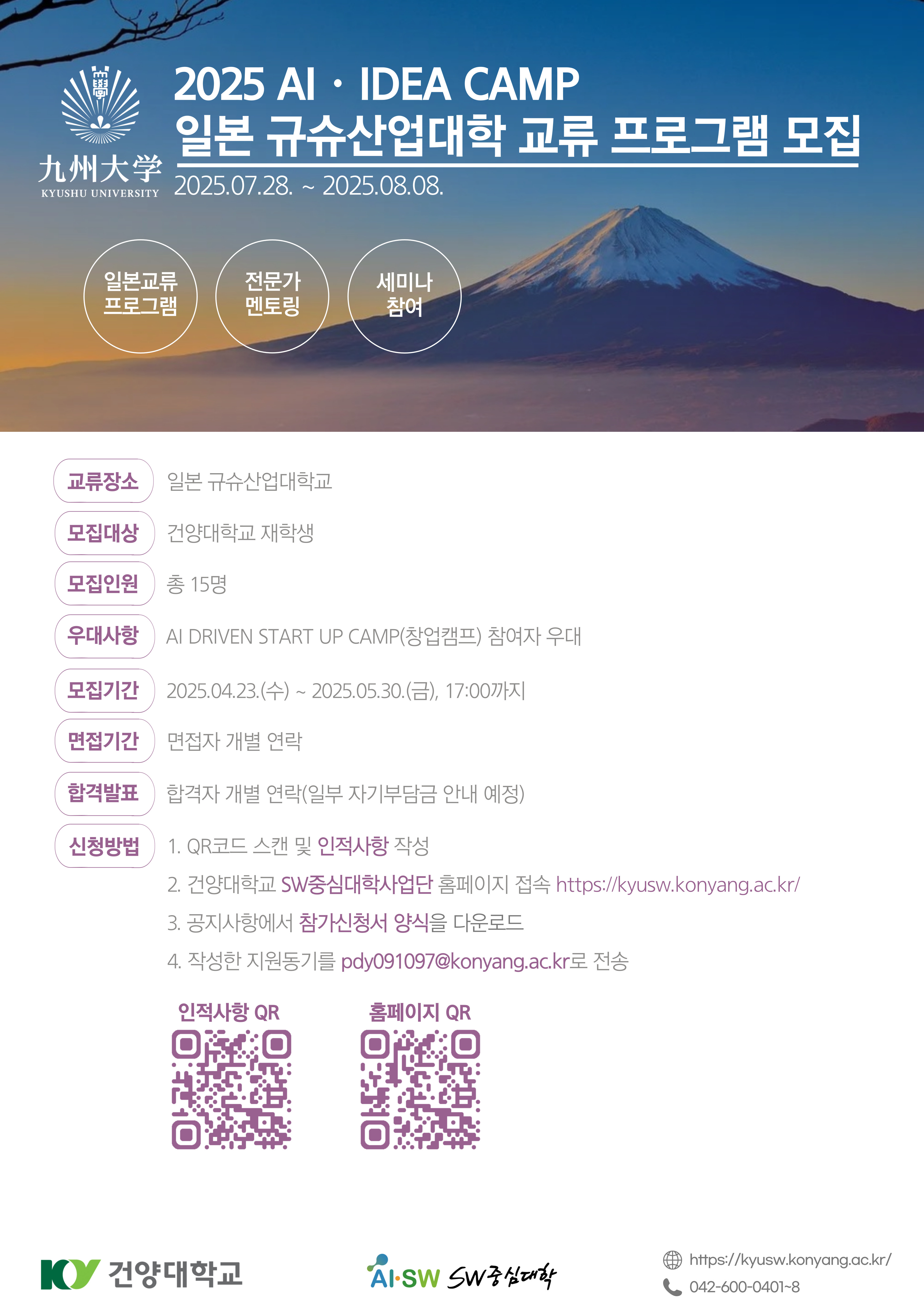 | 제목 | 2025 AIㆍIDEA CAMP 일본 규슈산업대학교 교류 프로그램 및 참가신청서 안내(연장) | ||||